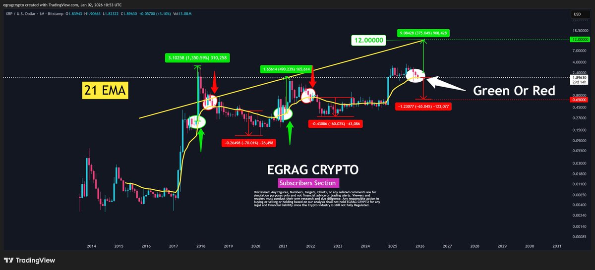 If XRP holds above the 21-EMA on a monthly close, EGRAG expects price to continue building a base for the next macro move higher. In that scenario, he outlines long-term upside targets extending into double-digit price territory, reflecting past cycle expansions once the EMA was firmly reclaimed.