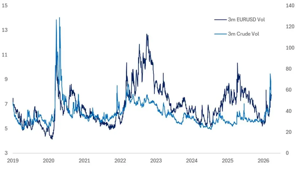 On the FX strategy front, Citadel Securities believes that given the dollar’s relatively moderate rise so far, and that implied FX volatility remains low across assets, call options on the dollar offer attractive, asymmetric protection against a scenario of renewed conflict escalation.