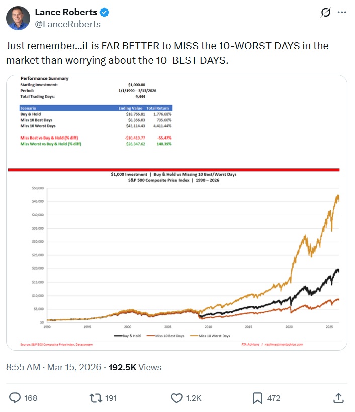 To sum it up, to hear this strategist tell it, you stood to make a lot more by averting the market’s biggest losses than you gave up by being out of the market on the days it notched its biggest gains. The implication is you should try to sidestep the worst days and worry less about participating in the best days.
