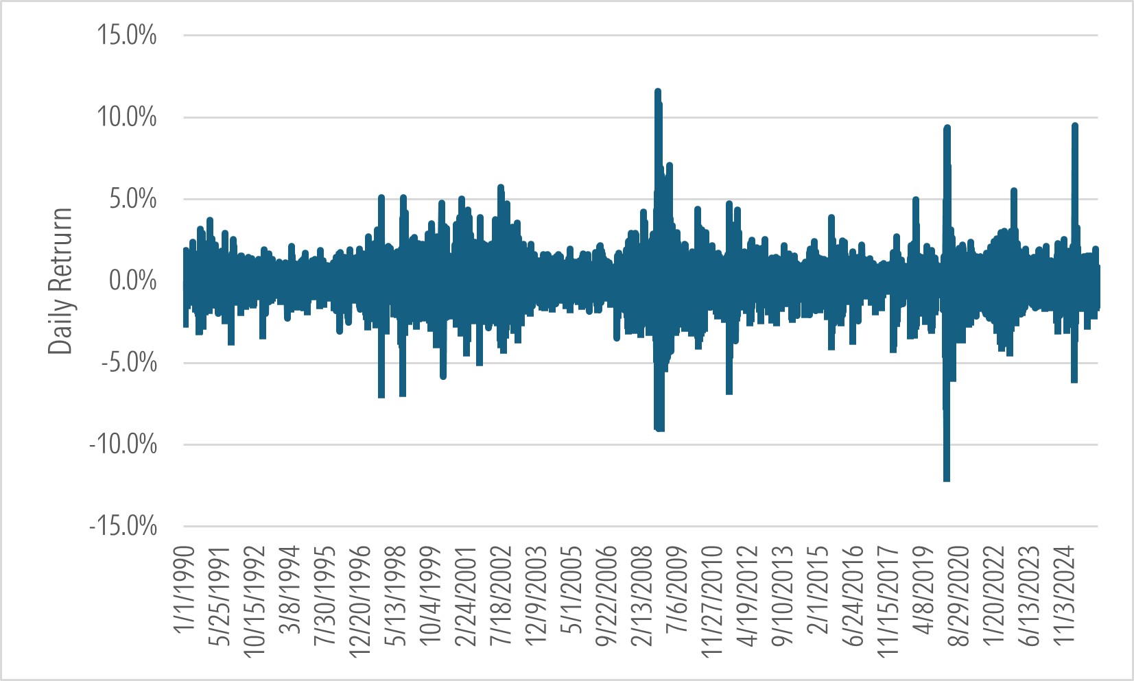 To this point, we haven’t talked about the elephant in the room: One’s ability to avoid the market’s worst days. To put that challenge in perspective, let’s go back to the post and the period it covered: Jan. 1, 1990, to March 13, 2026. Here’s a time-lapse of the S&P’s daily returns over that span: