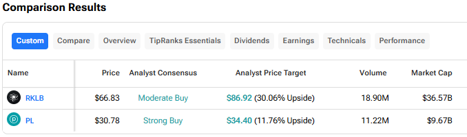 Turning to Wall Street, out of the two stocks mentioned above, analysts think that RKLB stock has more room to run than PL. In fact, RKLB’s average price target of $86.92 per share implies 30% upside versus PL’s 11.8%.