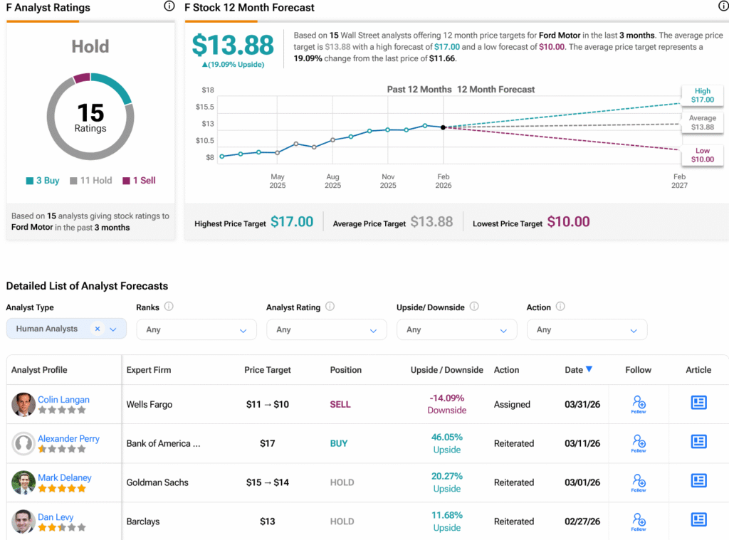 Turning to Wall Street, analysts have a Hold consensus rating on F stock based on three Buys, 11 Holds and one Sell assigned in the past three months, as indicated by the graphic below. After a 13.69% rally in its share price over the past year, the average F price target of $13.88 per share implies 19.09% upside potential.