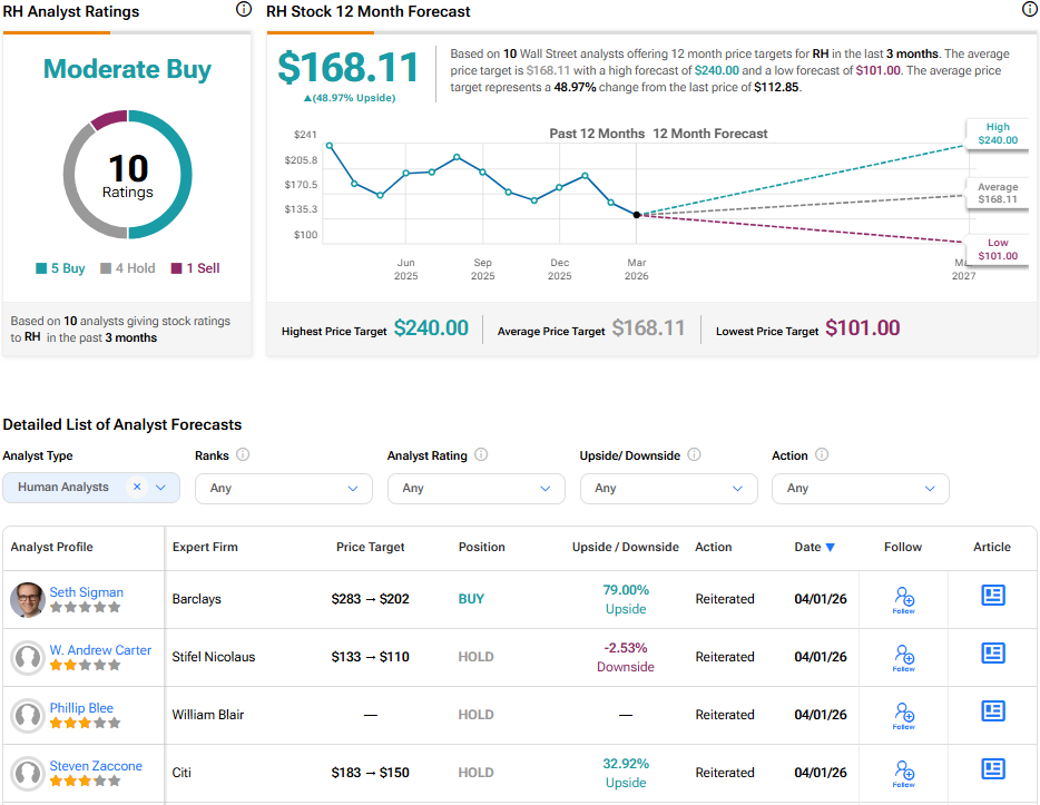 Turning to Wall Street, analysts have a Moderate Buy consensus rating on RH stock based on five Buys, four Holds, and one Sell assigned in the past three months, as indicated by the graphic below. Furthermore, the average RH price target of $168.11 per share implies 49% upside potential.