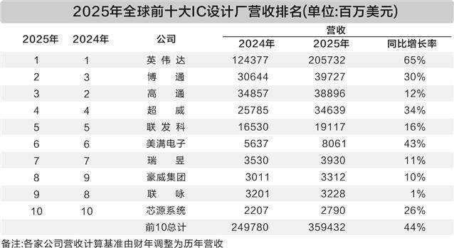 Driven by the wave of artificial intelligence (AI), the revenue of the world’s top 10 chip design companies has risen sharply. According to statistics, in 2025 the combined revenue of the world’s top 10 IC design companies exceeded $359.4 billion, up 44% year over year. Nvidia retained the revenue champion position, while Broadcom surpassed Qualcomm to become the second place. In addition, the A-share IC design leader, Himax Group, moved up to the eighth place globally.