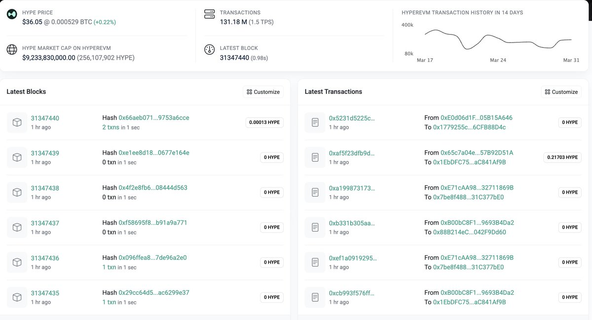 Deep Tide TechFlow message, April 02, according to on-chain security firm PeckShield (@PeckShieldAlert) monitoring, HyperEVM appears to be undergoing a major outage. The basis is that on the block explorer page, the latest block and transactions are both shown as being stuck at “1 hour ago.” Some blocks display zero transactions, and on-chain data appears to have stopped updating.
