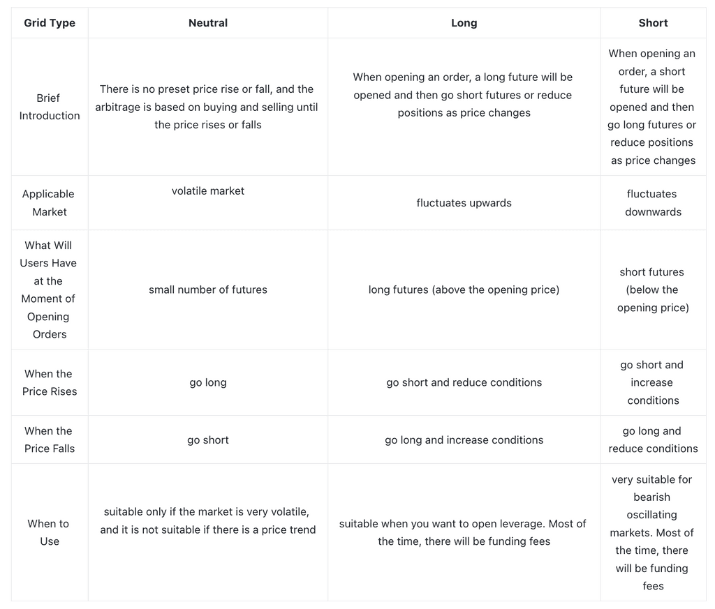 Normalmente, os usuários iniciam a grid neutra quando o mercado está volátil ou incerto, para realizar arbitragem. Como todos sabem, o grid long apenas abrirá e fechará posições longs, sendo adequado para mercados voláteis em alta, o que significa que, se o mercado cair bruscamente, ele terá prejuízo porque continuará comprando, reduzindo o custo de suas posições. Enquanto isso, os grids short apenas abrirão e fecharão posições shorts, sendo adequados para mercados voláteis em queda. Se o mercado subir bruscamente, haverá perda.
