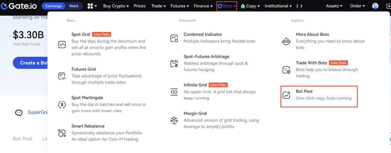Página inicial > Bots > Pool de bots > Criar um bot > Recomendar > Grid de futuros > Criar um Bot > Definir Parâmetros > Criar