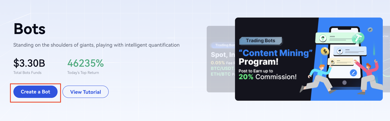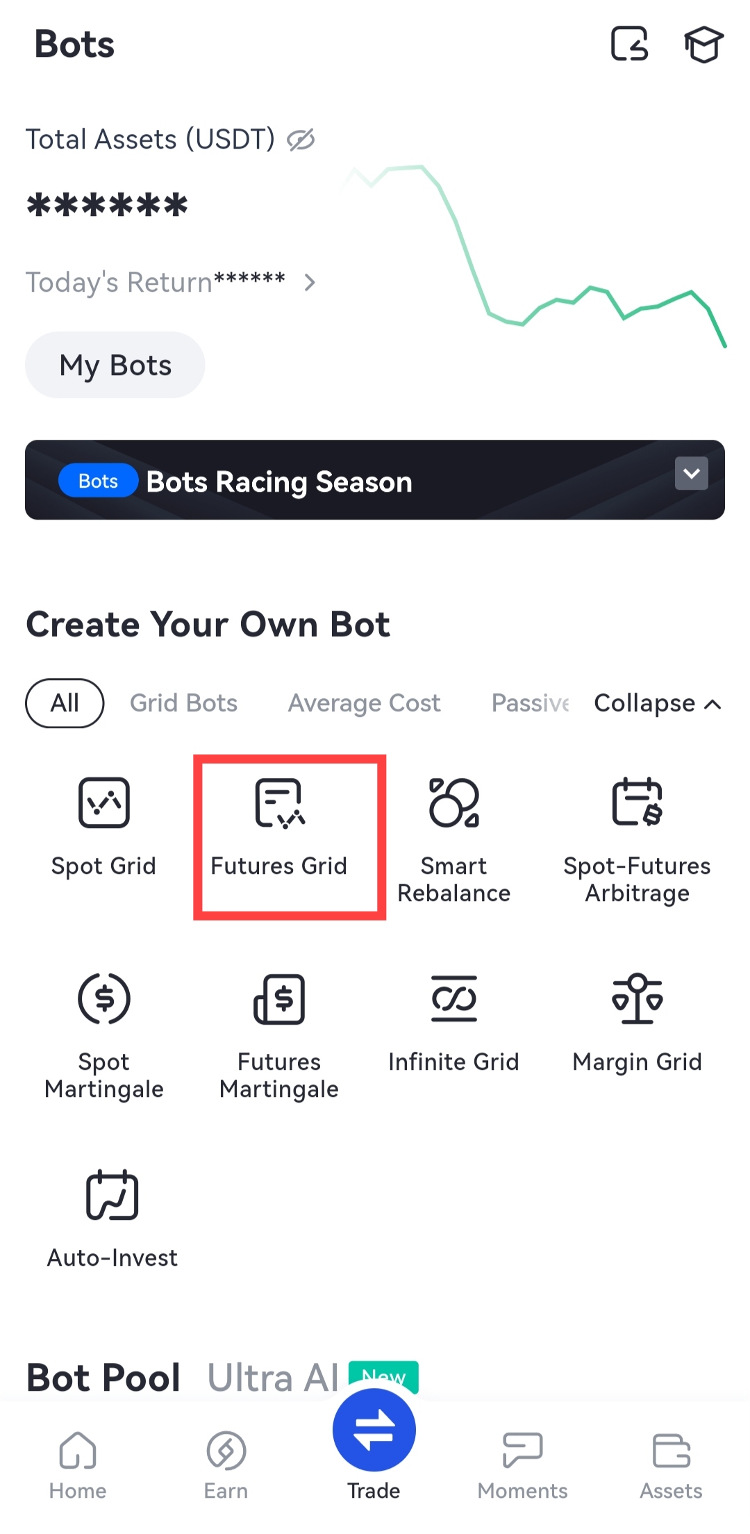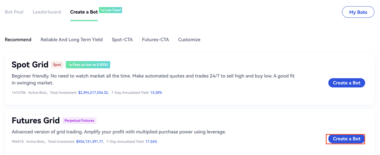 Página inicial > Negociar > Bots > Grid de futuros > Escolher Mercados > Recomendar/Personalizar > Criar