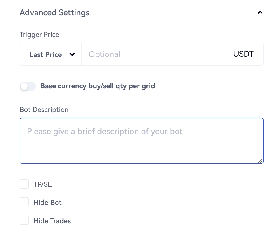 Preço de acionamento do bot: o grid só será executado quando o preço mais recente não for maior que o preço de acionamento. O preço de acionamento deve estar abaixo do preço mais recente e dentro do intervalo do preço mais baixo e do preço mais alto.