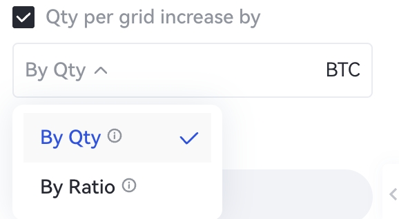 O incremento de quantidade está desativado por padrão. Quando ativado, é possível escolher aumentar o número de negociações por grid de forma incremental ou proporcional, conforme mostrado abaixo: