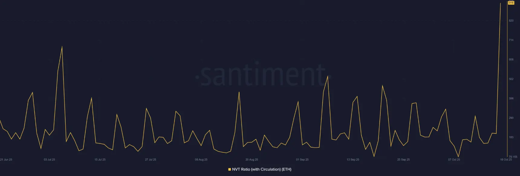 A taxa NVT ( Network Value to Transactions ) do Ethereum acabou de romper para 916, indicando que o valor de mercado do ETH está se expandindo muito mais rapidamente do que o nível de atividade real na rede.
