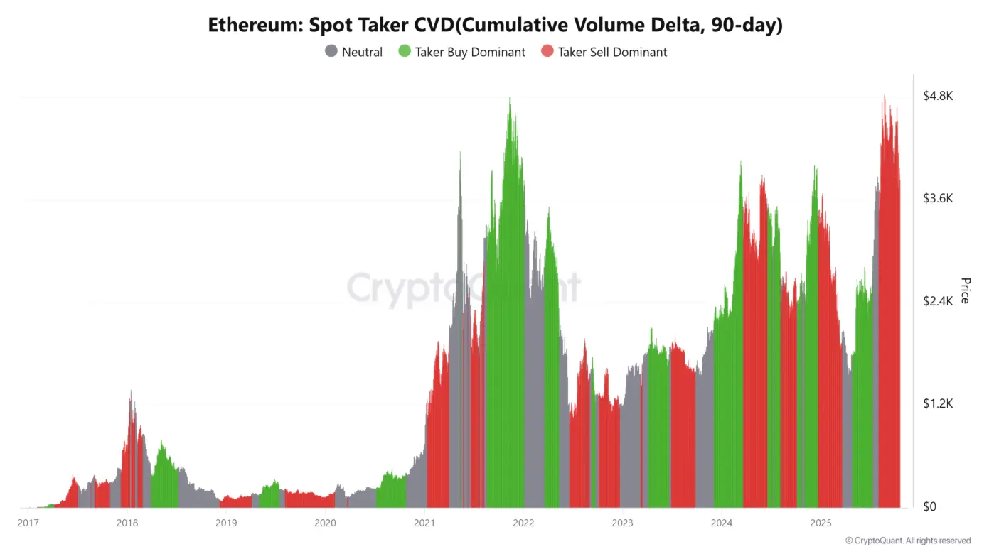Os dados do CVD do Spot Taker mostram que o lado vendedor (taker sell) está em vantagem, refletindo uma pressão crescente para realização de lucros à medida que muitos traders retiram lucros após a recente alta acentuada. Essa tendência indica que o token está gradualmente passando das mãos de investidores de curto prazo para aqueles que entraram tarde no ciclo de alta.