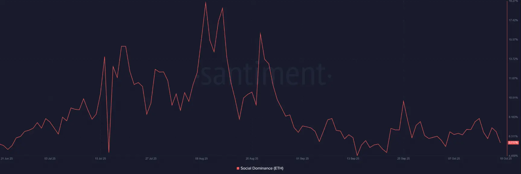 No momento da redação, a Dominância Social do Ethereum caiu para 5,17%, refletindo a desaceleração nas discussões sobre ETH, embora o preço tenha acabado de passar por uma recuperação breve.