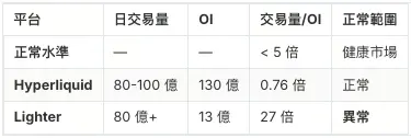 Esta anomalia na razão sugere fortemente que as duas novas plataformas populares, Lighter e Aster, apresentam um grande volume de negociações de lavagem a curto prazo. Normalmente, a razão entre o volume de negociações e os juros abertos deve estar dentro de 5 vezes, enquanto Hyperliquid está cerca de 0,76 vezes, e Lighter chega a cerca de 27 vezes, muito acima do nível normal.