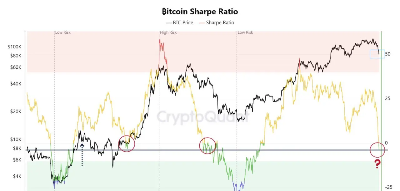 O índice Sharpe do Bitcoin está “num nível historicamente associado a momentos de máxima incerteza e às primeiras fases da reavaliação do risco,” disse o analista da CryptoQuant I. Moreno na segunda-feira.