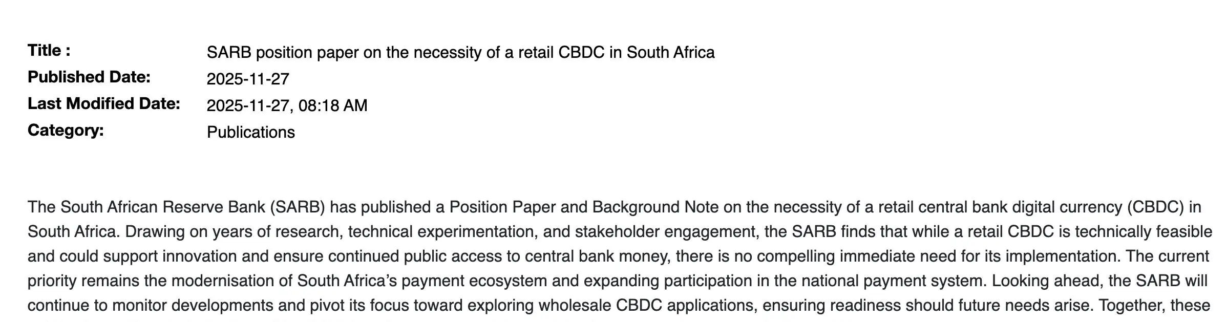 O Banco de Reserva da África do Sul (SARB) afirma que não vê uma necessidade urgente de lançar uma moeda digital de banco central para retalho (CBDC), argumentando antes que o país deve concentrar-se na atualização da sua infraestrutura de pagamentos existente.