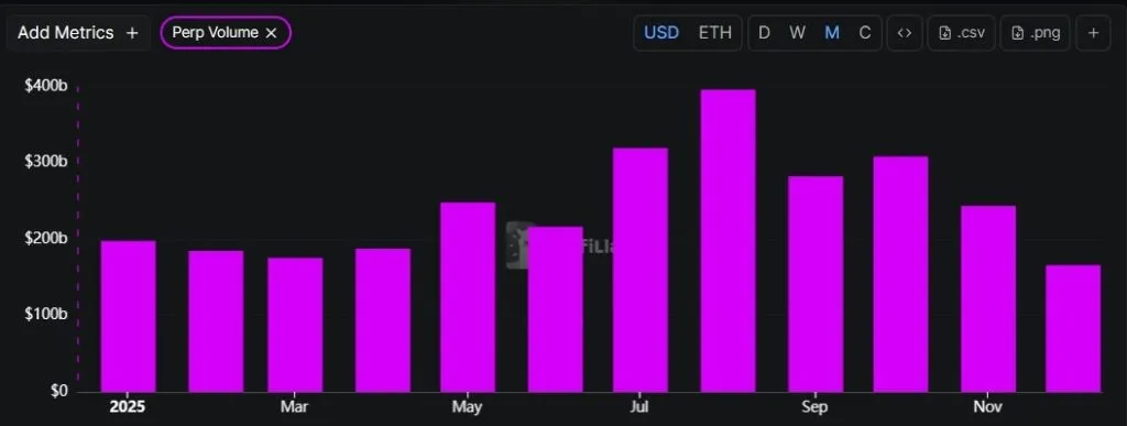 Fonte: DefiLlama. A situação mudou no meio do ano. A Lighter aumentou seus volumes mensais de menos de $50 bilhões para mais de $100 bilhões até o terceiro trimestre. A plataforma Aster apresentou um crescimento explosivo no final do ano, atingindo $259 bilhões em outubro e novembro.