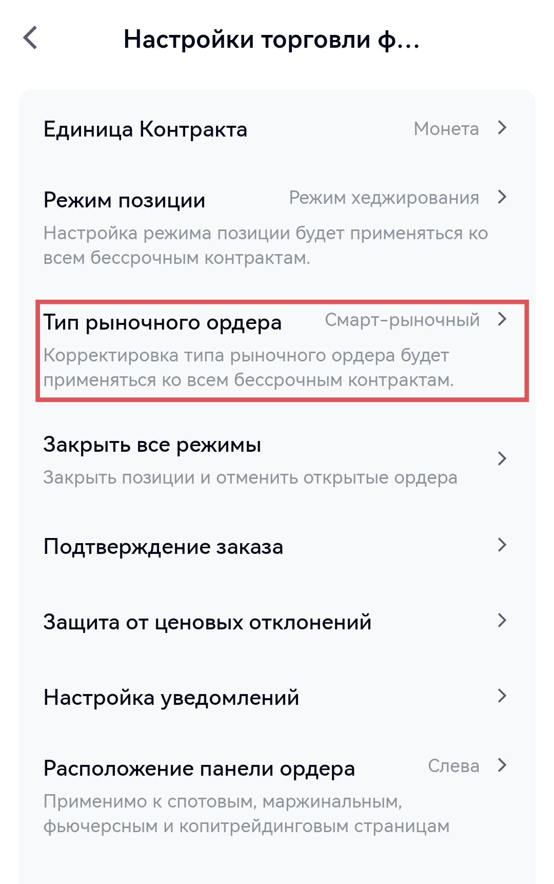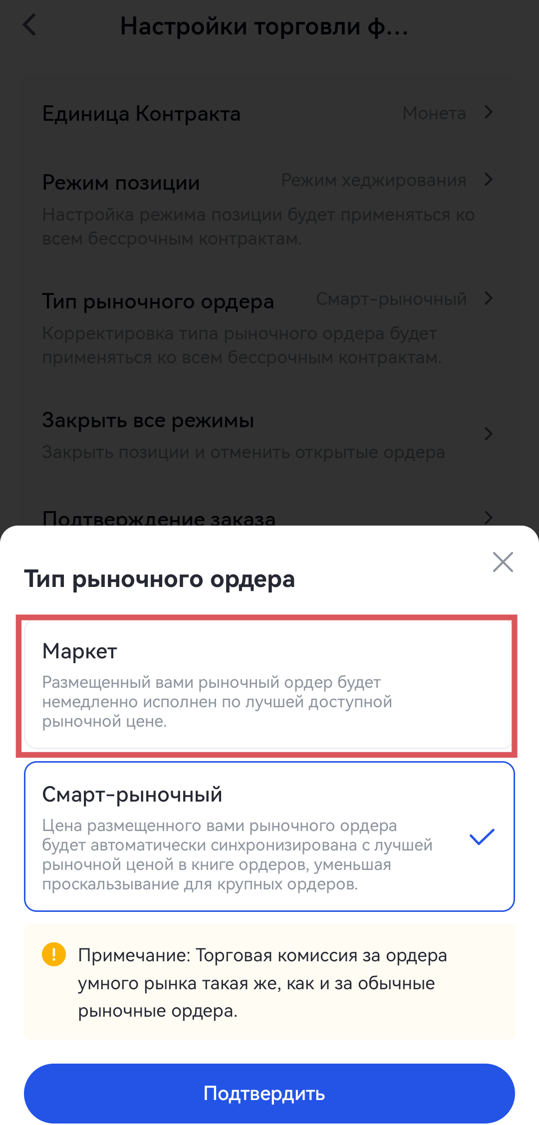 В настоящее время настройки платформы для торговли фьючерсами были обновлены, чтобы включить два типа рыночных ордеров: интеллектуальный рыночный ордер и обычный рыночный ордер. В настоящее время система по умолчанию использует режим “Интеллектуального рыночного ордера”. Чтобы защитить права копирующих, ведущим трейдерам рекомендуется перейти на обычный рыночный тип ордеров для открытия и закрытия позиций.