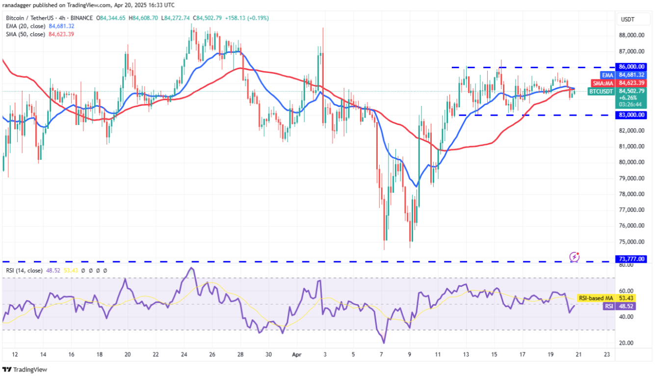 ! 4-часовой график BTC/USDT | Источник: TradingViewПара BTC/USDT торгуется в узком диапазоне между $83 000 и $86 000. Неспособность пробить верхнее сопротивление могла привести к тому, что краткосрочные инвесторы зафиксировали прибыль, утащив цену ниже скользящих средних. Торговля в этом диапазоне, скорее всего, продолжит быть случайной и волатильной.