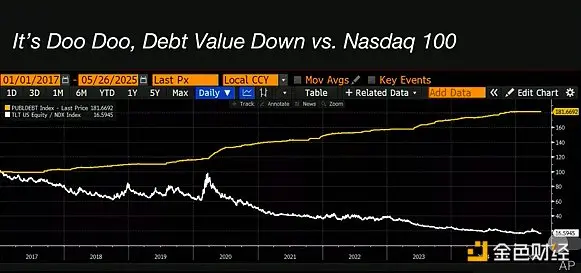 Так почему облигации являются плохими инвестициями? Здесь желтая часть — это график общего объема государственных облигаций США, начиная с 2017 года. Вы можете видеть, что он основан на 100, объем долга увеличился примерно на 80%. Затем я сравнил этот индекс с TLT (ETF, отслеживающим долгосрочные облигации) делением на индекс Nasdaq 100. Так что если график направлен вниз, это означает, что Nasdaq обгоняет облигации. С 2017 года по настоящее время Nasdaq обгоняет облигации примерно на 80%. Так что да, вы могли заработать деньги на купонах облигаций, но если бы вы вложили деньги в фондовый рынок, вы бы заработали на 80% больше.