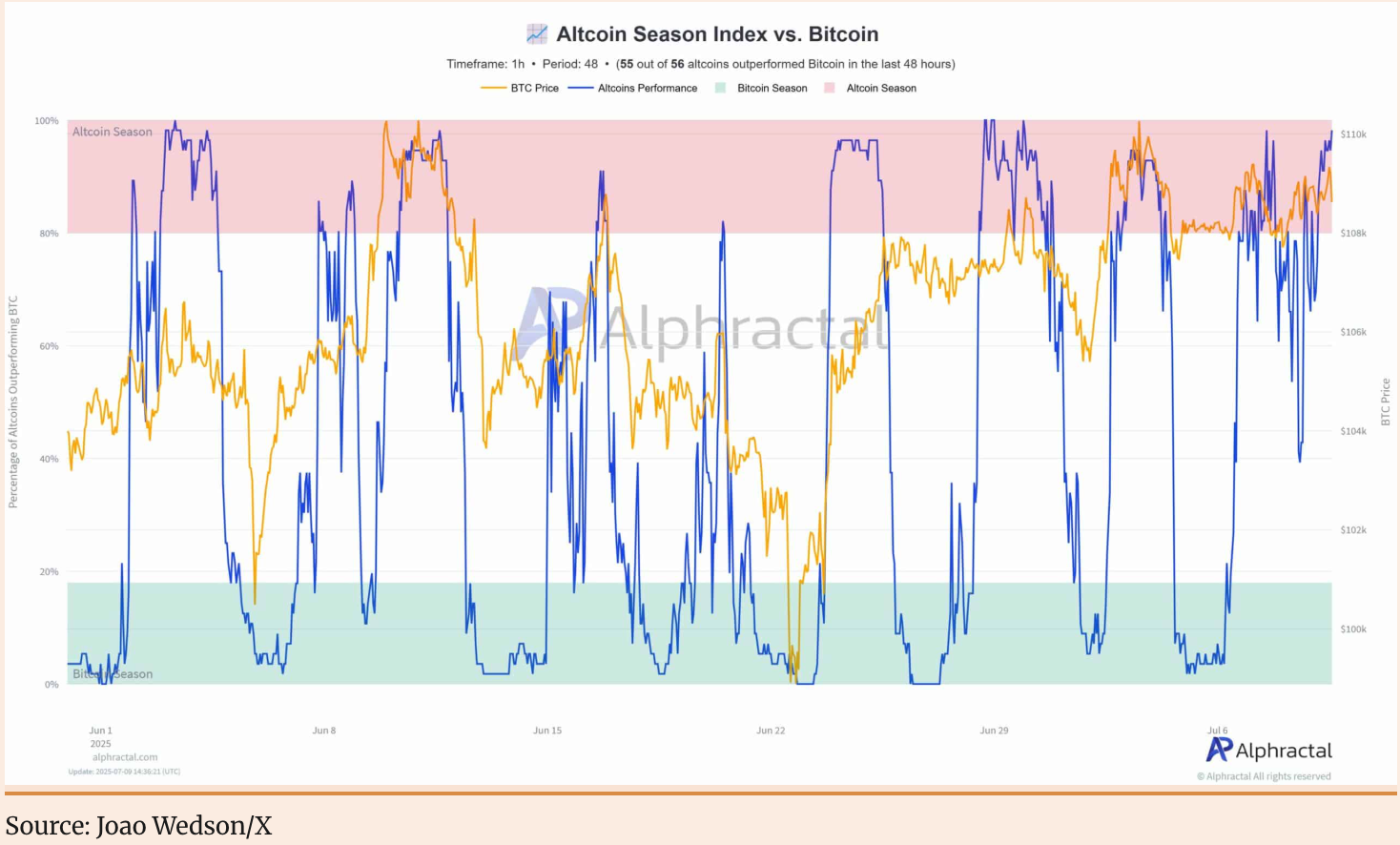 Согласно последнему анализу Жоао Уэдсона, в настоящее время, возможно, происходит мини-сезон альтов. На момент написания этой статьи 98% альтов на рынке показали результаты выше Бита за последние 48 часов. Эта тенденция привела к тому, что показатели альтов достигли области «Altseason», что свидетельствует о сильных рыночных показателях альтов в краткосрочной перспективе.