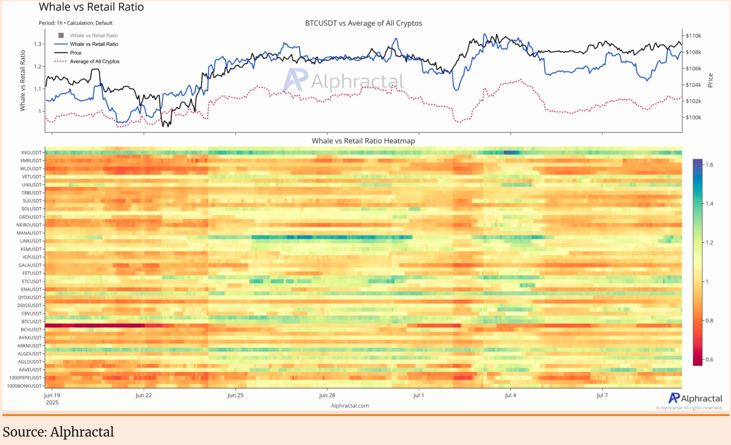 Еще одним фактором, указывающим на возможное наступление сезона альтов, является значительное увеличение объемов приобретений со стороны китов по сравнению с действиями розничных инвесторов. Согласно данным «Соотношение китов к розничным инвесторам» (Whale vs Retail Ratio), это соотношение с конца июня остается выше 1.1.