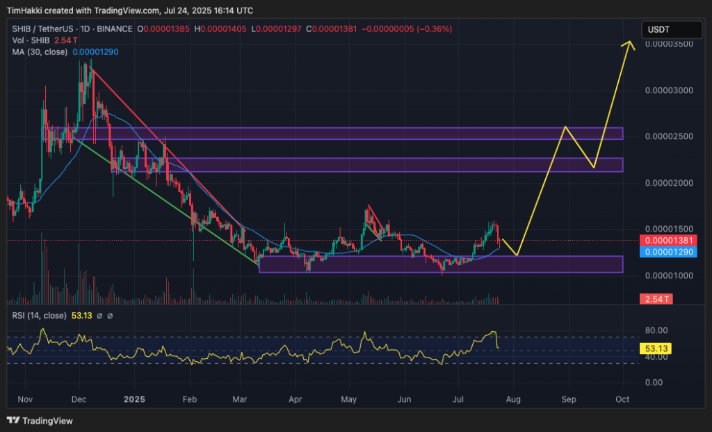SHIB текущая цена составляет 0.00001387 долларов, за последние две недели она выросла на 11.5%, за последние 30 дней на 20%. Она близка к прорыву двух ключевых технических формаций: нисходящего клина, сформированного с ноября по март, и бычьего флага, образованного в середине мая.