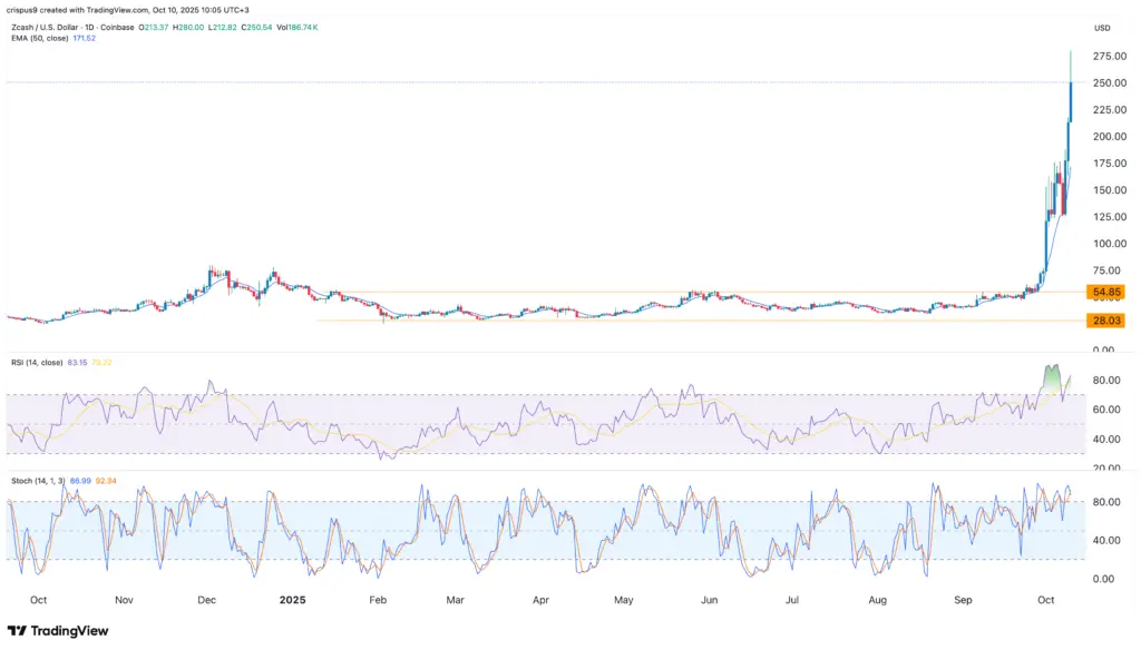 TradingViewСуществуют технические причины, по которым цена ZEC резко возросла на этой неделе. На дневном графике видно, что цена монеты оставалась в узком диапазоне с января по сентябрь. В этот период токен оставался внутри сопротивления на $54 и поддержки на $28.