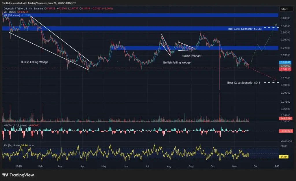 Догекоин (DOGE) появился в 2013 году, изначально будучи лишь шуткой, но сейчас он стал основным криптоактивом с рыночной капитализацией около 23 миллиардов долларов, почти составляя половину всего рынка мемкоинов в 47 миллиардов долларов. На протяжении всего конца лета и начала осени DOGE формировал несколько восходящих паттернов на графиках, но сейчас, похоже, он находится на грани краха.