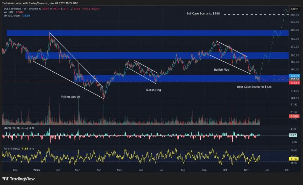 Очевидно, это не помешало SOL в недавних ценовых трудностях, хотя он, похоже, хорошо выдержал сегодняшнее падение, увеличившись на 1% за ночь, и его торговая цена составляет 132 доллара. Пессимистичный прогноз Perplexity также отражает эту устойчивость, прогнозируя, что SOL в течение следующего месяца вырастет всего на 3 доллара, достигнув торговой цены в 135 долларов к Новому году.