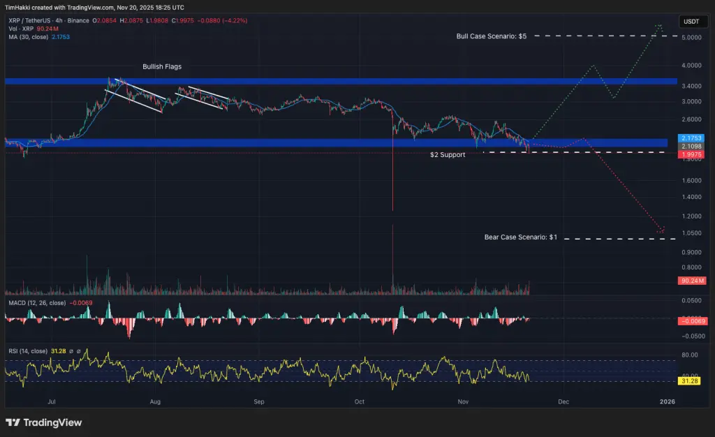 С технической точки зрения, XRP с середины года находился в узком диапазоне консолидации, образовав несколько бычьих флагов, но пока не преодолел верхнюю границу. Его индекс относительной силы (RSI) колеблется около 31, близко к зоне перепроданности, что указывает на то, что токен находится на дне значительной распродажи. С этой точки зрения, XRP, возможно, переживает последнюю волну панической распродажи, после чего может произойти технический отскок.
