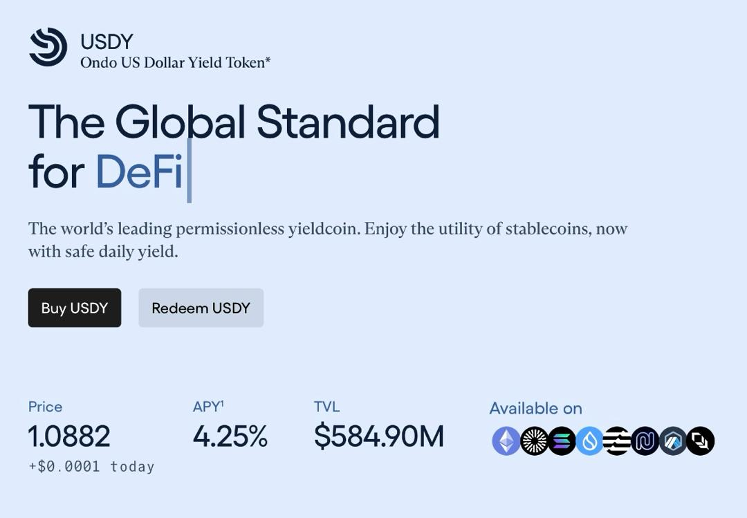 Ondo выпускает USDY на основе депозитов USDC. Вложенные активы используются для покупки низкорисковых активов, таких как казначейские облигации (примерно 4 - 5% годовых), большая часть процентов делится между держателями USDY.