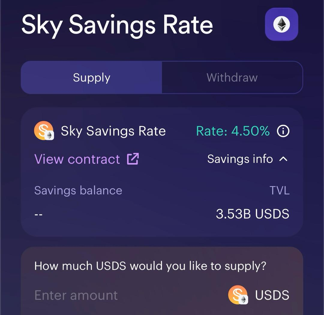 Он может использоваться для DeFi, а также для получения дохода через Sky ставку сбережений (SSR) контракт от Sky Protocol. sUSDS выпущен на основе депозитов USDS с годовой процентной ставкой 4.5%.