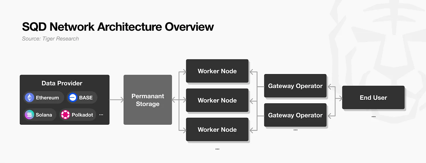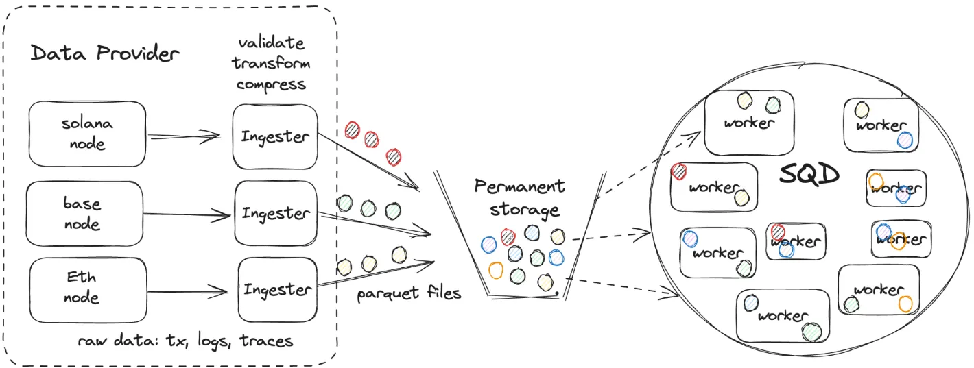 SQD Ağı, merkeziyetsizlik mimarisi aracılığıyla bu kısıtlamaları çözmektedir. Veri sağlayıcıları, Ethereum ve Solana gibi birden fazla blok zincirinden ham verileri toplar. Verileri bloklara ayırır, sıkıştırır ve meta verilerle birlikte ağa yüklerler. Çalışma düğümleri, veri sağlayıcıları tarafından oluşturulan kalıcı depolama içindeki verileri bloklara ayırarak dağıtık depolama yaparlar. Sorgu istekleri geldiğinde, bunları hızlı bir şekilde işler ve yanıtlarlar. Her bir çalışma düğümü, kendine ait depoladığı verileri sunan mini bir API gibi çalışır. Tüm ağ, binlerce dağıtık API sunucusu gibi işler. Ağ geçidi operatörleri, son kullanıcılar ile ağ arasındaki arayüzü sağlar. Kullanıcı sorgularını alır ve işlenmesi için uygun çalışma düğümlerine iletirler.