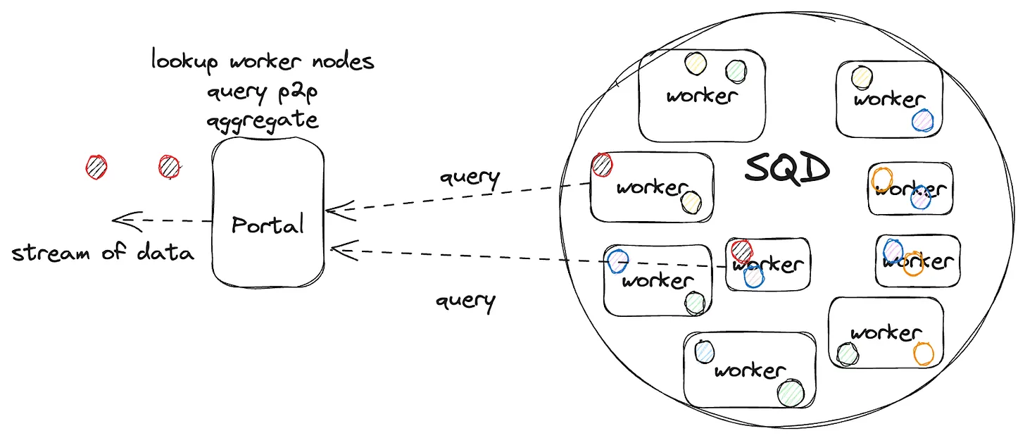 SQD ekibi bu sorunu SQD Portal ile çözmeyi hedefliyor. Portal'ın temeli merkeziyetsiz ve paralel işlemde yatıyor. Tek bir sorgu, birçok parçaya bölünür ve aynı anda yaklaşık 3000 veya daha fazla iş düğümüne istek gönderilir. Her bir iş düğümü kendisine atanan parçayı paralel olarak işler. Portal daha sonra bu yanıtları gerçek zamanlı olarak toplar ve akış halinde teslim eder.