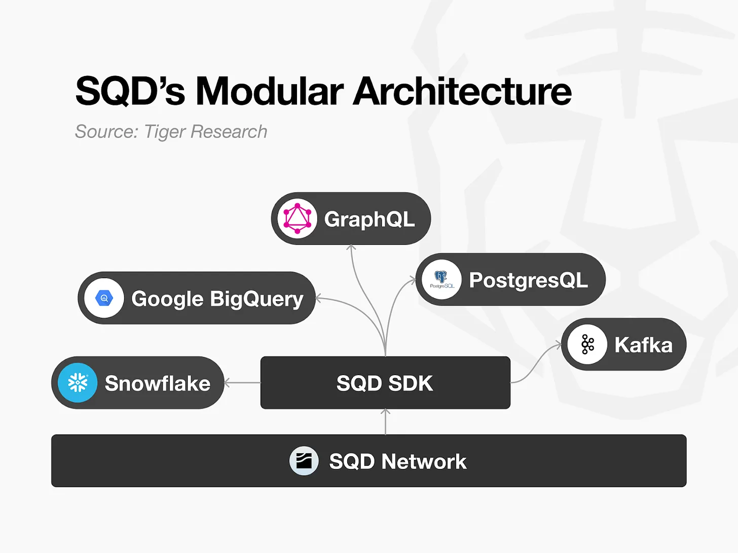 SQD Ağının bir diğer belirgin özelliği modüler yapısıdır. Mevcut indeks çözümleri, veri toplama, işleme, depolama ve sorgulama gibi tüm aşamaları tek bir sistemde işleyen monolitik bir yapı kullanmaktadır. Bu, başlangıç ayarlarını basitleştirirken, geliştiricilerin veri işleme yöntemleri veya depolama yerleri seçme özgürlüğünü kısıtlamaktadır.