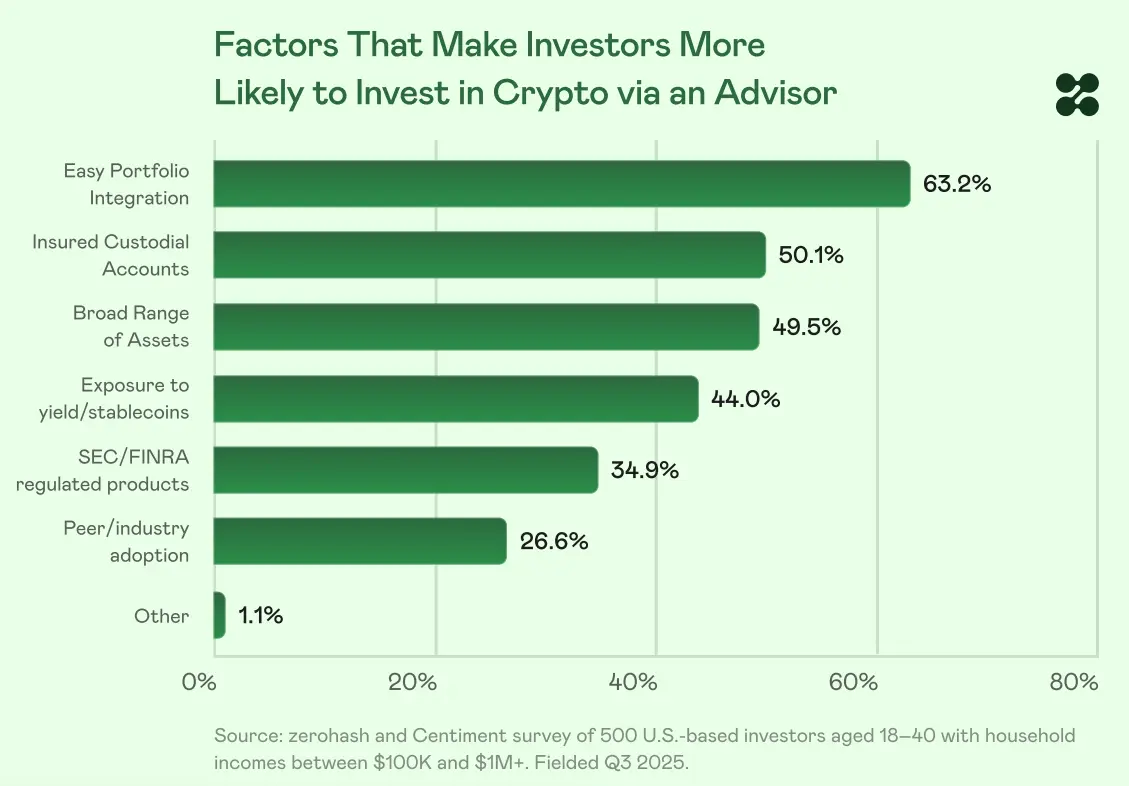 Zerohash, anket sonuçlarına dayanarak, danışmanların yatırımcıları kazanmak için oyun kitabının, kriptoyu “geleneksel varlıklarla aynı kontrol panelinde” sunmak ve sigortalı saklama sağlamaktan geçtiğini söyledi.