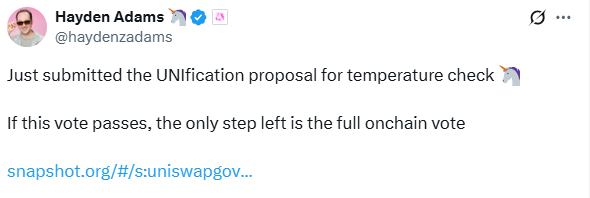 Kaynak: CoinEdition Orijinal Başlık: Uniswap’ın UNInception’ı: Protokol Neden Nihayet Ücret Anahtarını Açıyor Orijinal Bağlantı: Uniswap kurucusu Hayden Adams, tarihi bir yönetişim önerisi sundu. “UNInception” başlıklı plan, protokol ücretlerini aktifleştirmeyi ve ekosistem genelinde teşvikleri uyumlu hale getirmeyi amaçlıyor. Adams, bunun tam bir zincir üstü oylama için ilk adım olduğunu belirtti.