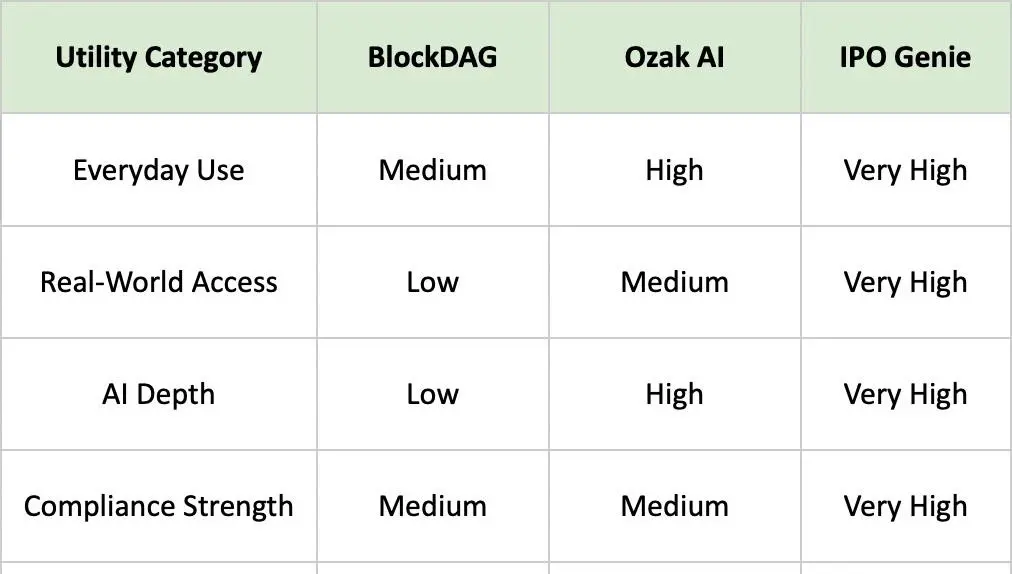Her kripto karşılaştırmasında, IPO Genie güçlü bir performans sergiliyor çünkü net bir kullanım durumu ile gerçek bir problemi çözüyor.