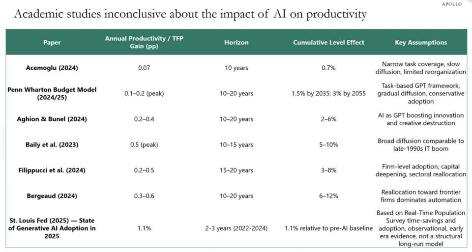 Despite hopes for unlocking a new era soaring growth and abundance, AI has yet to manifest itself clearly in macro data, according to Apollo Chief Economist Torsten Slok.