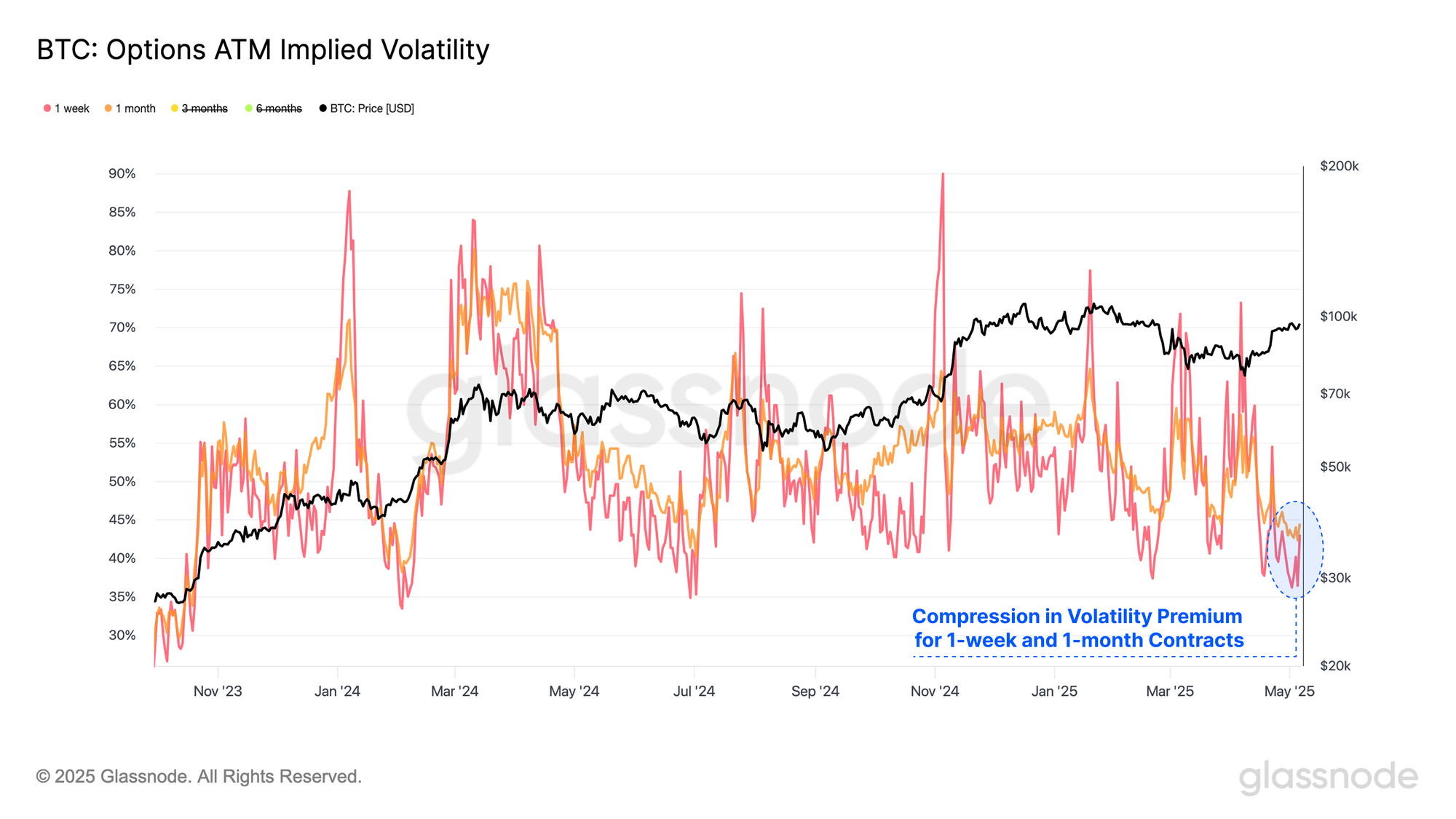 Нарешті, ринок опціонів забезпечує зовнішній погляд на волатильність. Імпліцитна волатильність ATM за 1 тиждень та 1 місяць знизилася до найнижчого рівня з липня 2024 року, що відображає недооцінку інвесторами майбутньої волатильності. Історично, низька волатильність часто передвіщає прихід періоду високої волатильності, в поєднанні з високою щільністю пропозиції у блокчейні, ринок, можливо, готує бурю.