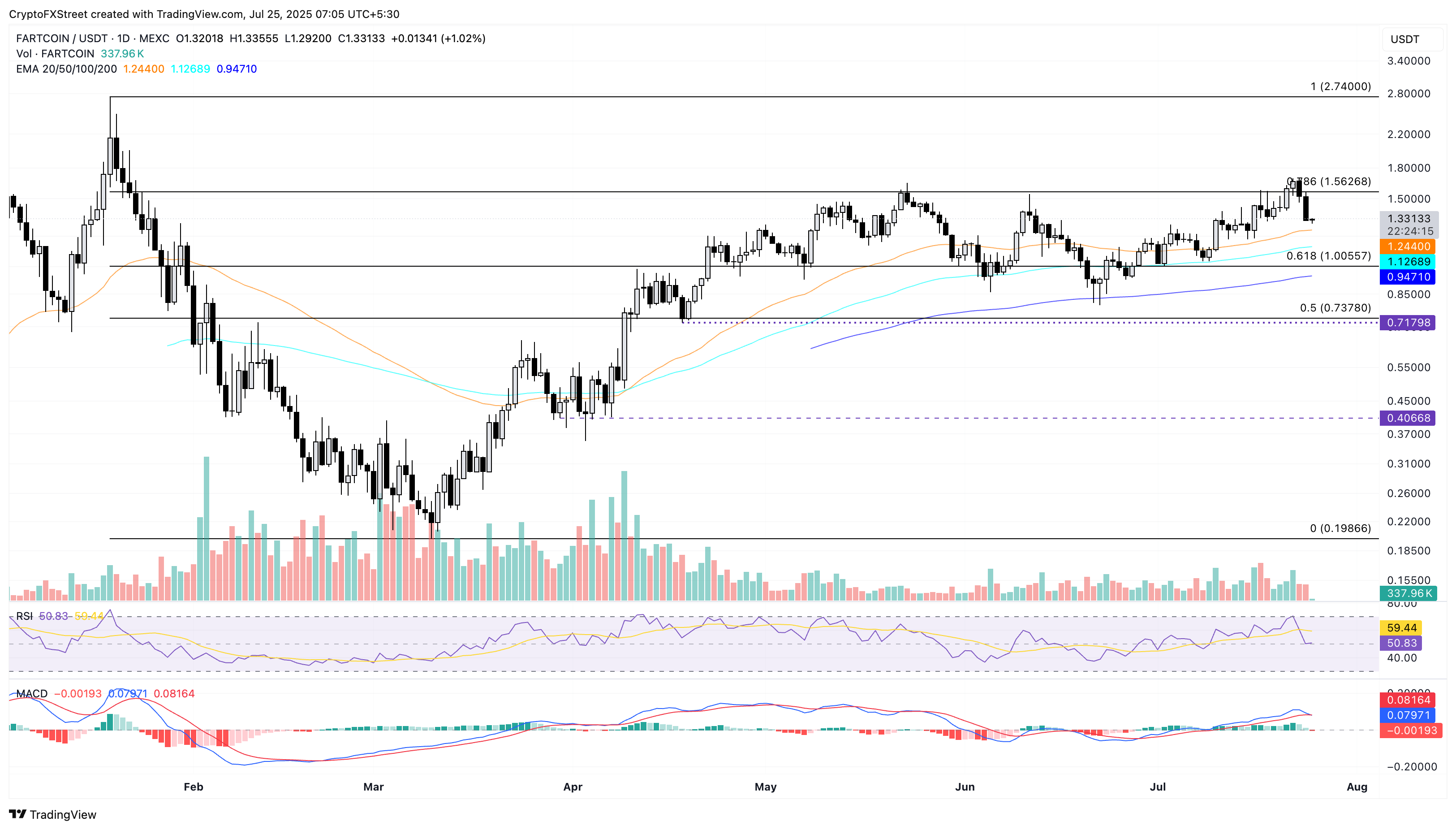 Ціна Fartcoin поступово наближається до 50-денної експоненційної середньої (EMA), яка становить 1,24 долара. Якщо вона повністю проб’є динамічну підтримку, то можна очікувати тестування рівня Фібоначчі 61,8% на 1,00 долара.