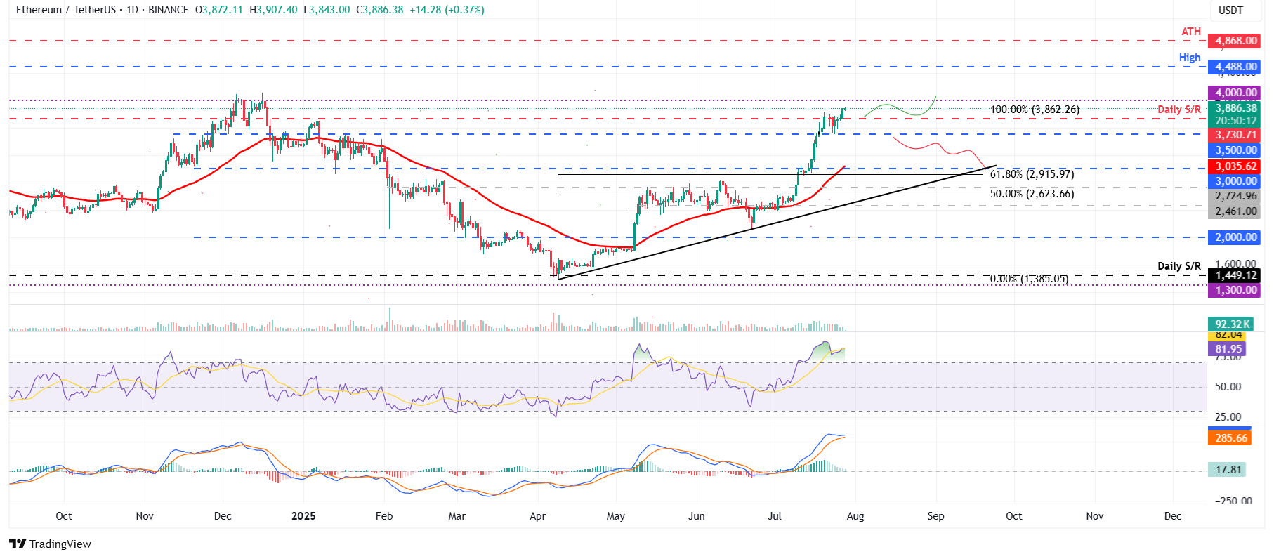 Ціна Етеру в четвер знову протестувала та знайшла підтримку поблизу рівня 3 500 доларів на денному графіку, після чого піднялася майже на 8%, закрившись у неділю вище денного рівня опору 3 730 доларів. Станом на понеділок, коли було написано цю статтю, ціна монети залишалася вище 3 800 доларів.