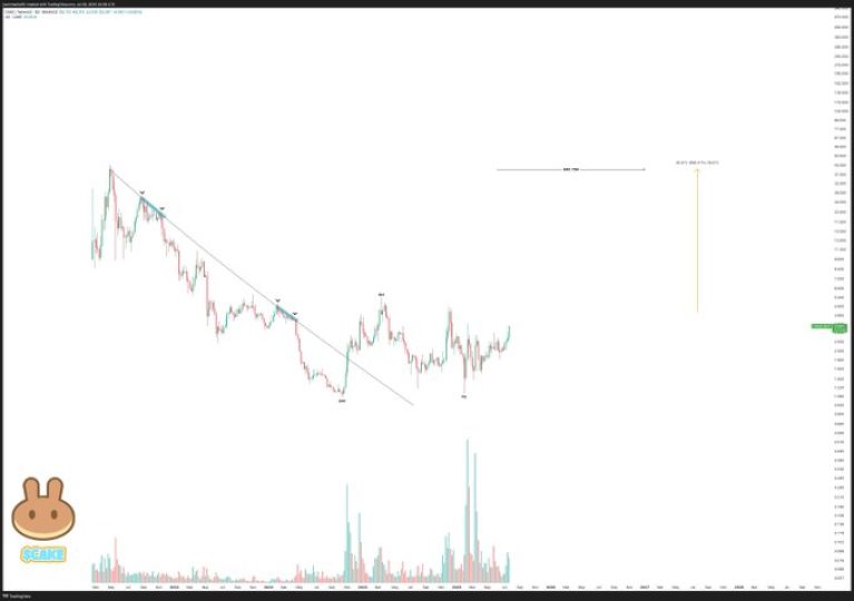 Відомий аналітик Javon Marks на X поділився інформацією, що ціна CAKE перебуває в структурі підтвердженого прориву, а довгострокова цільова ціна становить 40,79 доларів. Він зазначив, що якщо ця структура буде реалізована, це може означати понад 1 100% потенційного зростання.