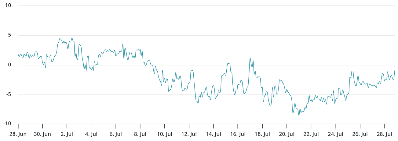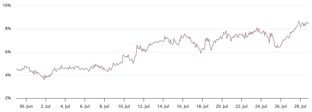 Глобальний ринок все ще підписується на переговори щодо імпортних мит США, аналітики попереджають, що якщо не вдасться досягти угоди, ризик економічної рецесії може значно зрости. Незважаючи на те, що Китай у понеділок досяг торгової угоди з Європою, 12 серпня є останнім терміном для досягнення угоди Китаєм. Таким чином, трейдери, здається, більше схиляються до утримання готівки або розміщення в короткострокових облігаціях.