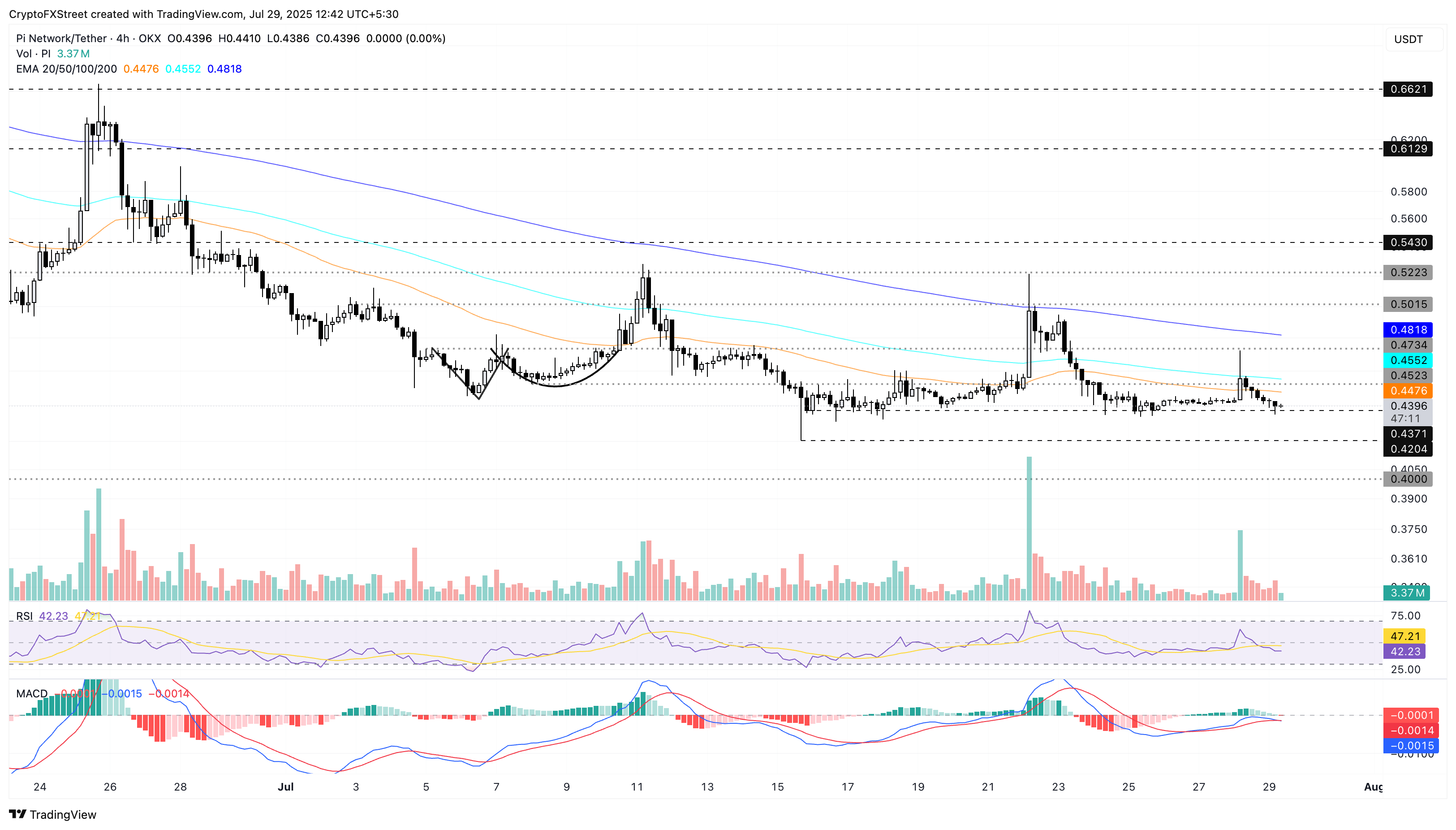 Монета PI цього тижня не змогла утримати бичачий тренд, оскільки тиск на продаж вище 100-денної експоненціальної ковзної середньої (EMA) призвів до повторного тестування рівня підтримки 0.43 долара, який залишався стабільним з 15 липня.