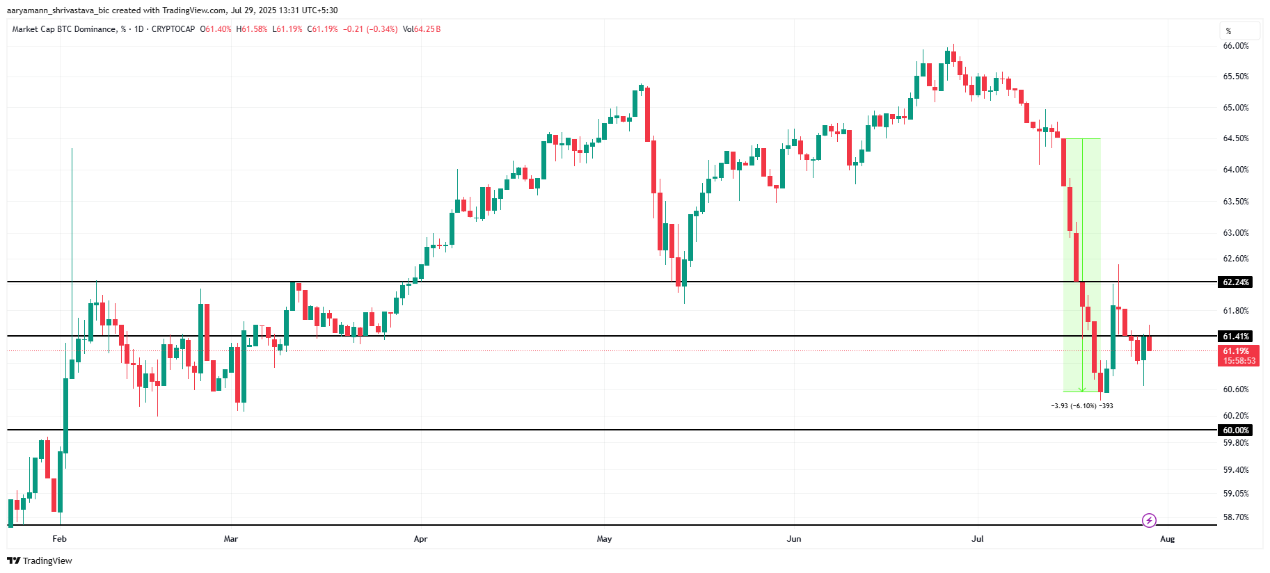 Після зниження на 6,1% на початку цього місяця, домінування Біткойна нещодавно почало відновлюватися. Спад домінування Біткойна спочатку розглядався як сигнал про те, що сезон альткоїнів наближається.