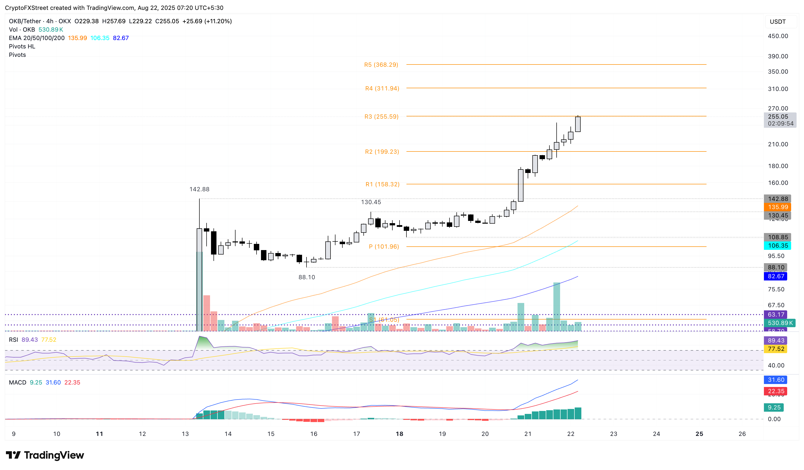 OKB протягом двох днів сильно зросла, у четвер злетівши на 33%, а в п’ятницю знову піднявшись на 7%, подолавши позначку 250 доларів та досягнувши рівня спротиву R3 на 255 доларів.