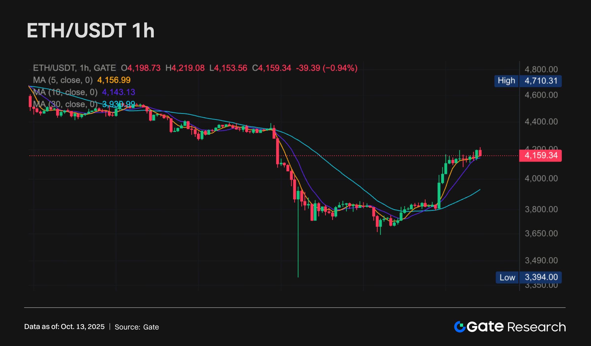 Унаслідок новин про митні збори та впливу від розриву з USDE, ETH 11 жовтня зазнав помітного падіння обсягу торгів, досягнувши мінімуму в 3 394 доларів, але потім швидко стабілізувався та відновився, продемонструвавши сильну тенденцію до відновлення на короткому проміжку. Наразі ціна знову перевищила середні значення MA5 та MA10, утворивши структуру золотого перетину, одночасно прорвавши MA30, що вказує на домінування бичачої сили в короткостроковій перспективі.