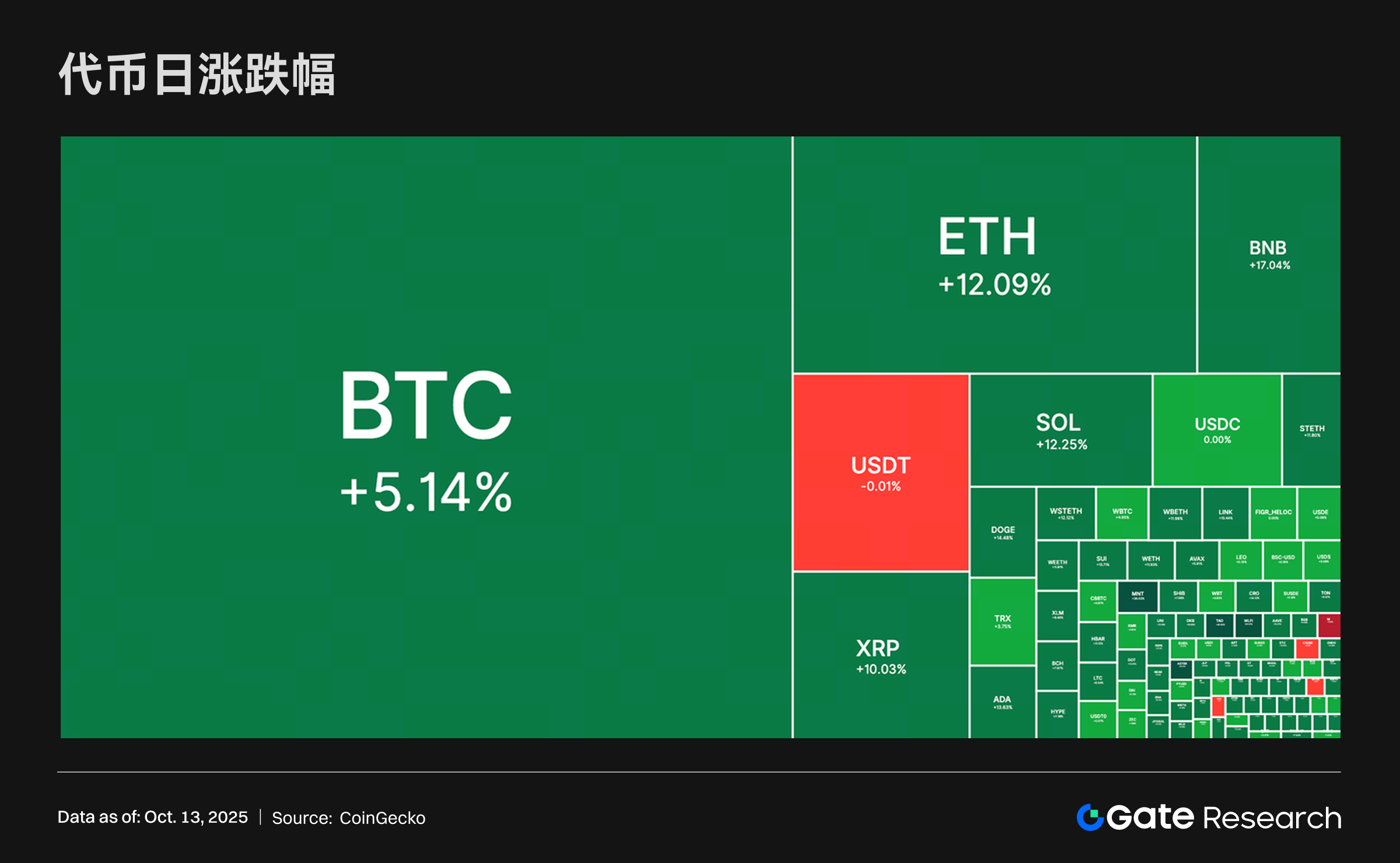 Протягом останніх 24 годин емоції на ринку шифрування значно покращилися, загалом спостерігається сильний ріст. BTC зріс на 5,14%, продовжуючи впевнено триматися на позиції ринкового барометру; ETH показав ще кращі результати, підскочивши на 12,09%, очоливши відновлення основних активів. Токени провідних публічних блокчейнів також зміцнили свої позиції, SOL зріс на 12,25%, а XRP піднявся на 10,03%.